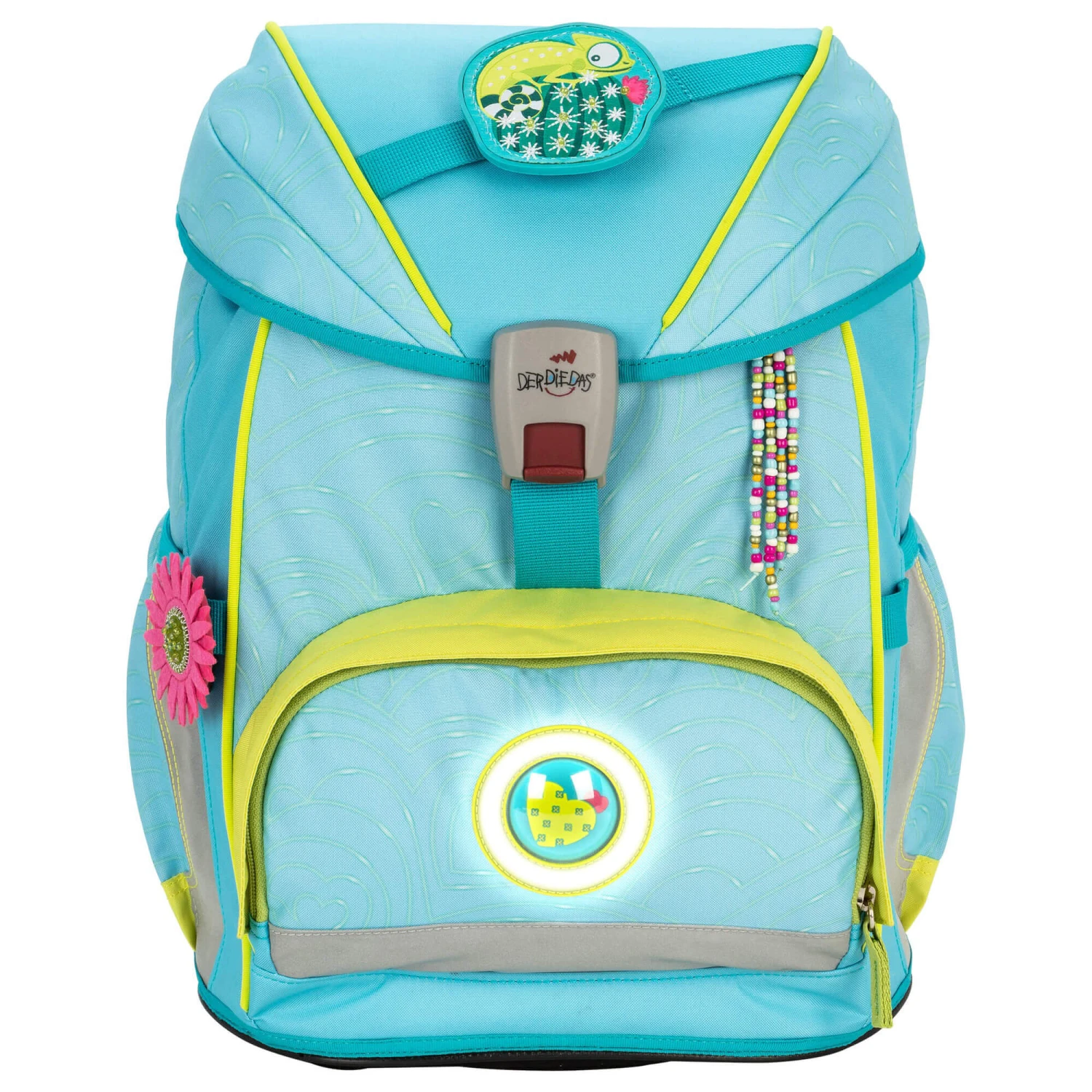 Der ErgoFlex Schulrucksack wird durch den extrahellen LED-Ring um das Bullauge herum besonders sichtbar und unübersehbar im Dunkeln. Dank seines cleveren Tragegurtsystems wächst er mit und entlastet den Kinderrücken. Die großen reflektierenden Flächen sorgen zusätzlich für einen sicheren Schulweg. Der Schulrucksack von DerDieDas ist durch seinen ergonomischen Aufbau mit einem verstärkten und gepolsterten Rückenteil, dem Lagekontrollriemen zur optimalen Anpassung im Schulterbereich, ergonomischen Tragegurten (einfach mit Klettband zu fixieren und stufenweise von XS bis XL an die Rückenlänge des Kindes anpassbar), einem verstellbaren Brustgurt und Beckengurt, optimal auf die Anatomie Ihres Kindes anpassbar. Die Deckelschschließe ist mit einem Fidlock Magnetschloss ausgestattet. Ein geräumiges Frontfach bietet Platz für das Etui oder die Brotdose. In den flexiblen Seitentaschen lassen sich eine Trinkflasche und der Regenschirm sicher verstauen