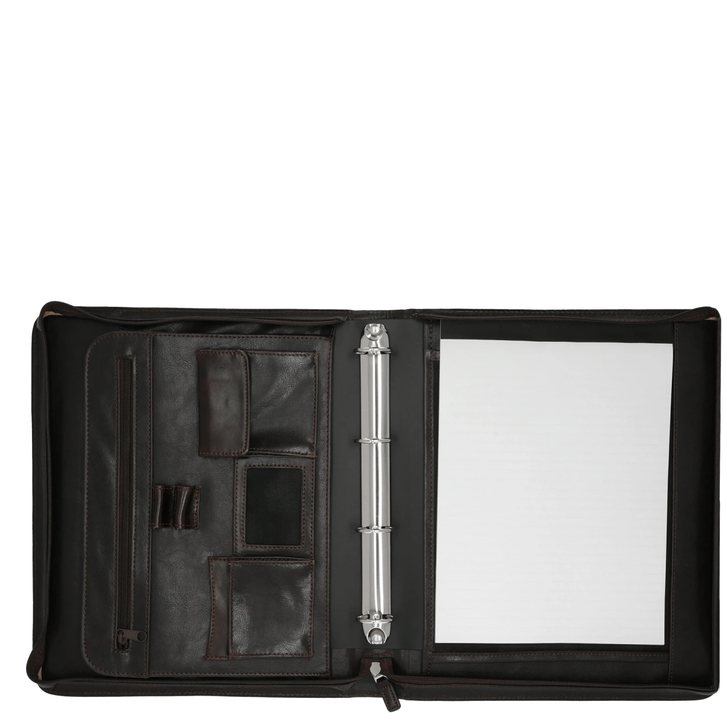 - Links: 2 große Einschubfächer mit Keilen, aufgesetzte RV-Tasche, 2 Stiftlaschen, Einschubfächer für Visitenkarten, Klarsichtfach und eine aufgesetzte Tasche mit Überschlag