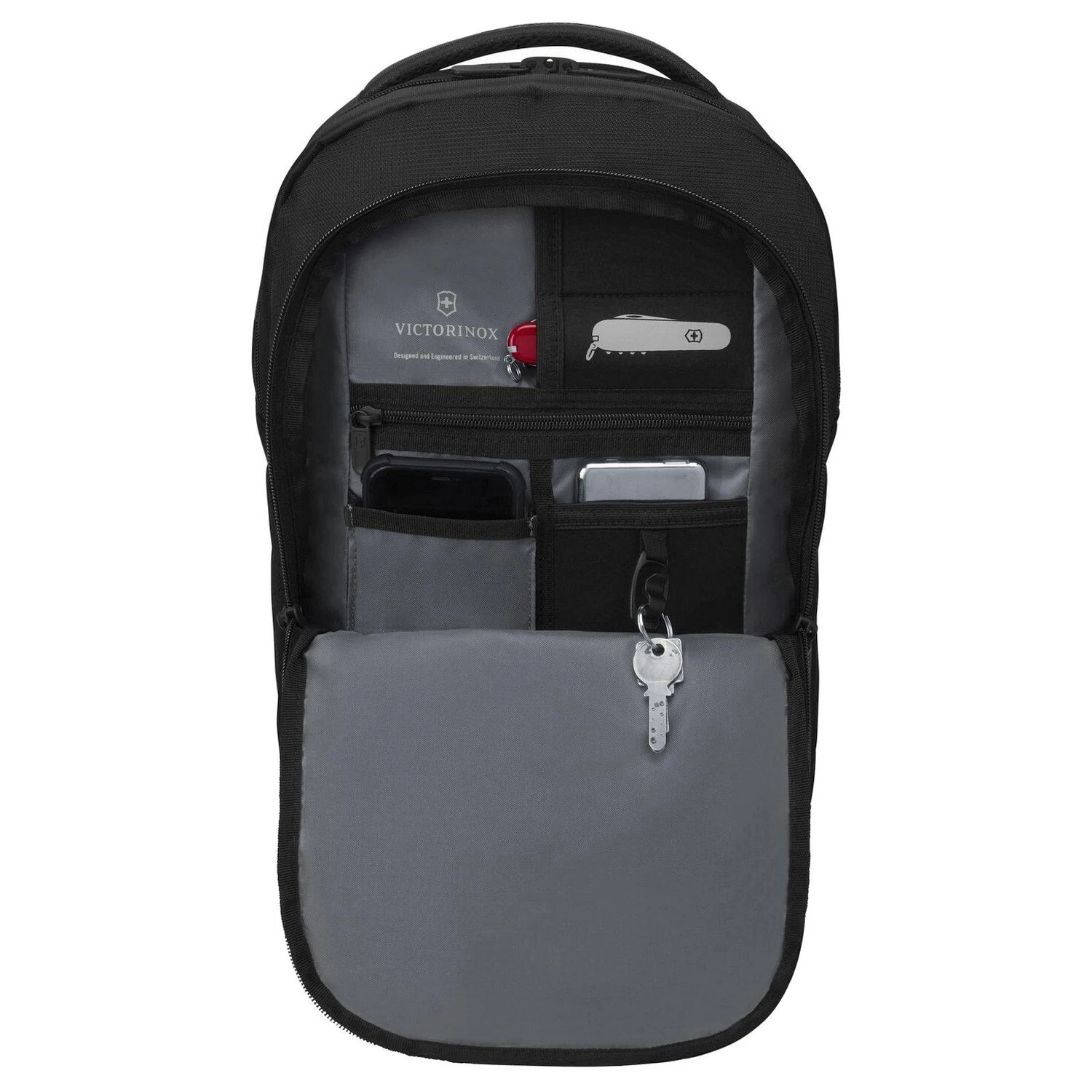 - Reißverschlussfach, Schlüsselhalterung, Steckfach und Handyfach
